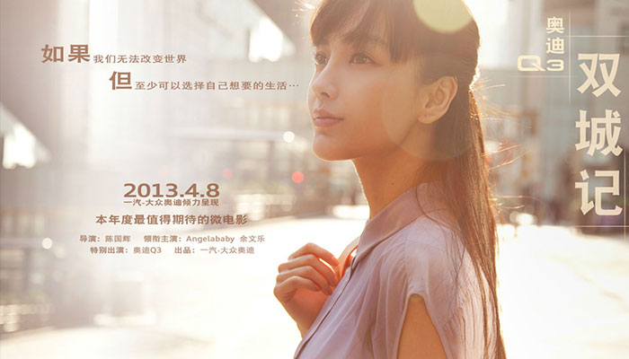 同样是2013年, Angelababy和余文乐共同出演奥迪Q3微电影《双城记》。Angelababy饰演一个漂亮文艺女青年,一开始就背米兰昆德拉的话提升逼格:“如果我们无法改变世界,但至少可以选择自己想要的生活。”说完她就开着一辆奥迪Q3去兜风了,路上和经营小画室的余文乐看对眼,然后一个人兜风就变成了两个人兜风。