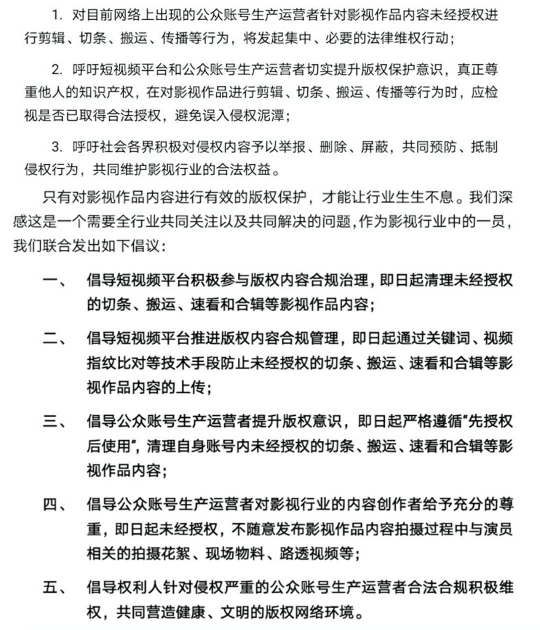 第一份文件显示,针对涉及影视作品未经授权的剪辑、切条、搬运、传播等行为,版权方将采取必要的维权措施,暂时未对短视频平台进一步施压;而在第二份倡议书中,则明确要求短视频平台即日起清理影视作品的切条、搬运、速看、合辑等内容,几乎将全体影视二创作者和短视频平台绑定为“命运共同体”。