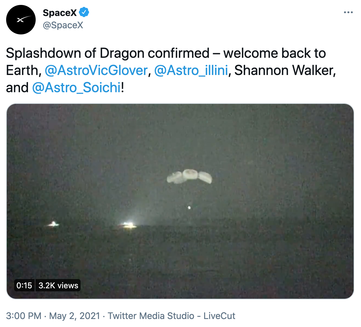飞船成功返回地球后,意味着“龙”飞船第一次全面运行的载人任务顺利完成,这也标志着NASA和SpaceX一个里程碑任务的结束。