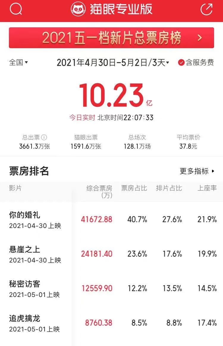 而《悬崖之上》达成了档期内口碑最佳,“是老谋子近五年最稳定的一次发挥,也大概率是今年五一档最能看的一部。”有影迷评价。但是电影却没能战胜爆米花味香甜的青春片。