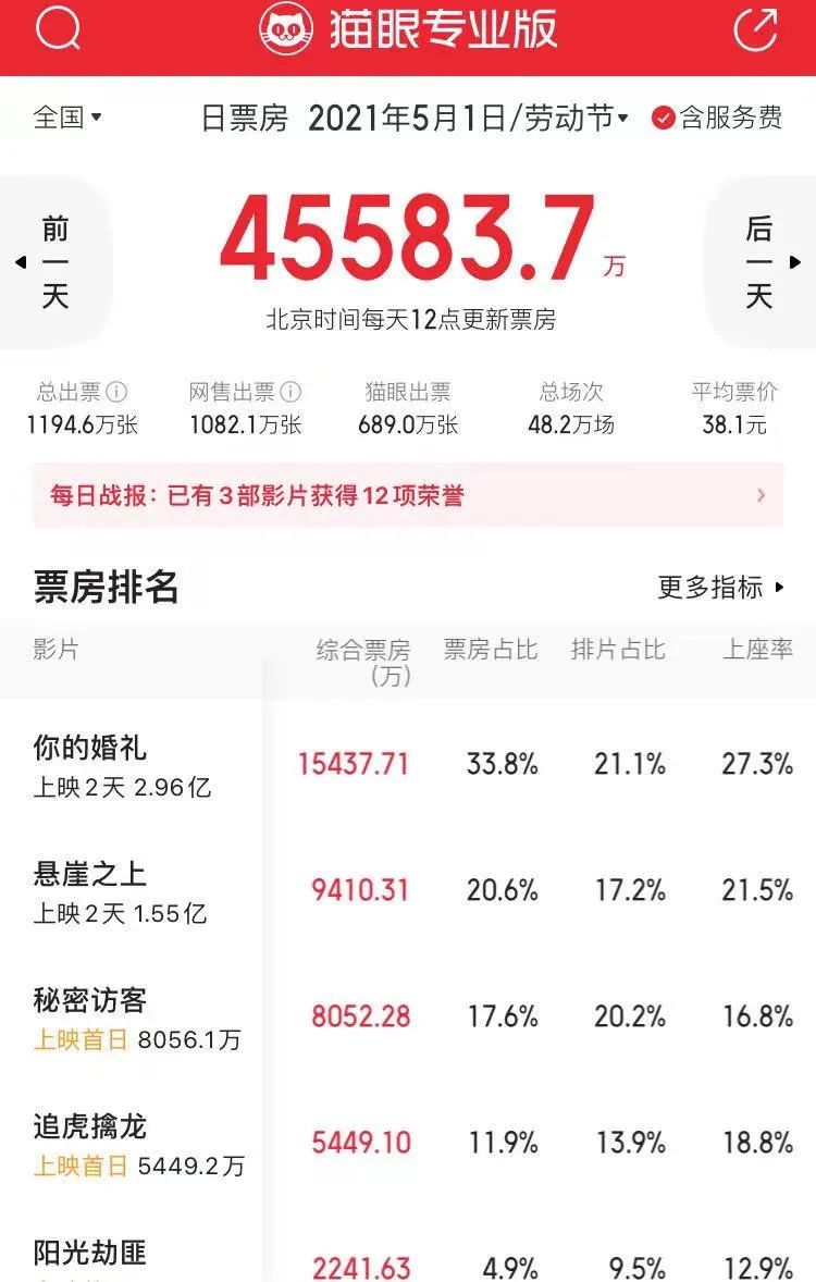 档期内腰部电影无形中显露出了票房短板。虽然五一档看起来依旧红火,但是票房走势不温不火,相比2020年出人意料的跨年夜,4月初创新高的清明档,五一档十分温和。