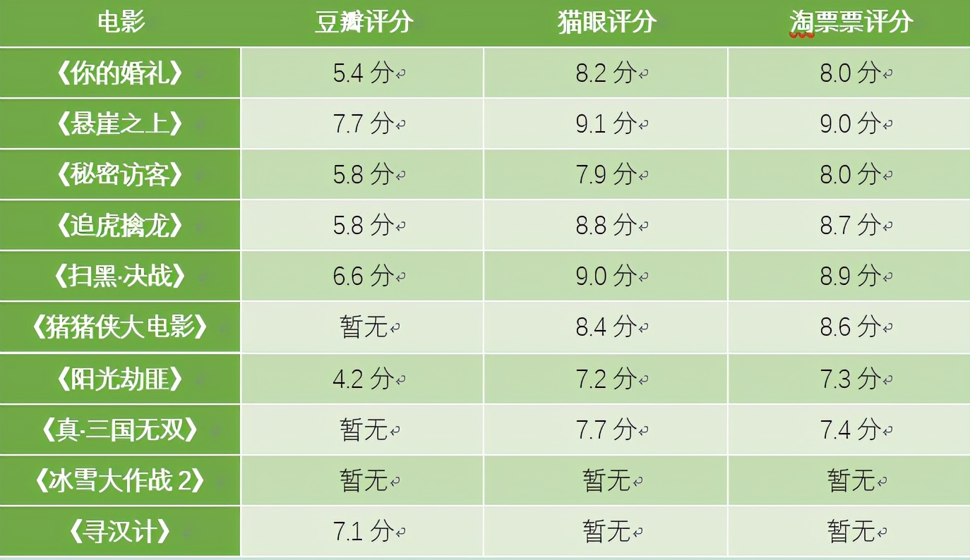 票房之外,让人担忧的还有今年五一档的电影口碑。截至写稿时间,上映10部电影口碑走势基本明朗,这其中豆瓣、猫眼、淘票票三个平台评分综合最高的是《悬崖之上》,豆瓣评分达到了7.7分,而完成票房领跑的《你的婚礼》豆瓣评分仅5.4分。