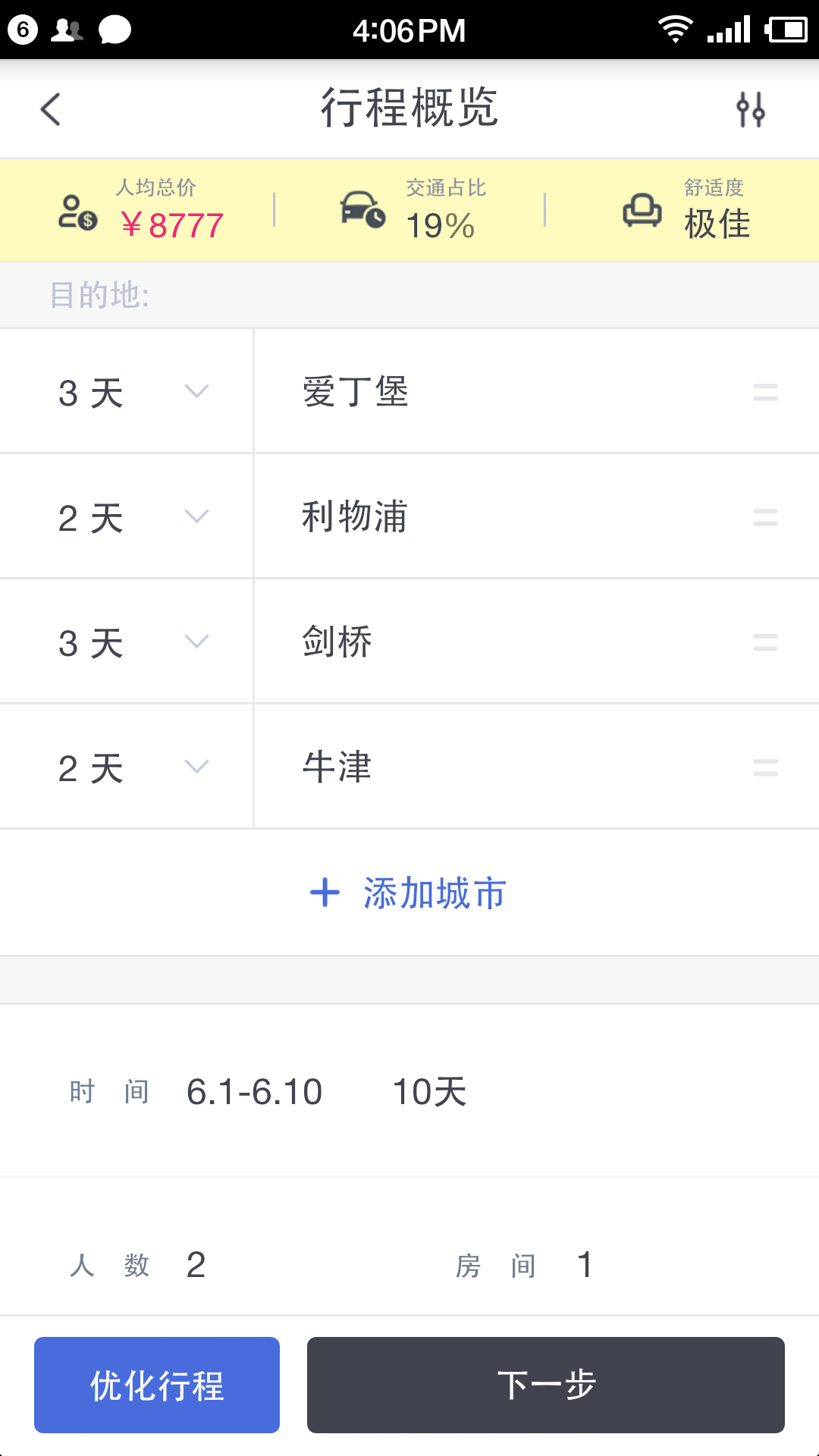 在妙计App中输入目的地城市、时间、人数,之后选择偏好的交通工具,可以容忍的中转次数、航班起降时间,不能忍的航空公司一系列选项条件,就会得到最优行程路线。行程路线会显示,这些城市分别适合玩几天、总价多少、交通用时如何。再细化,你可以继续在推荐的产品里选择酒店和景点,实时形成每一天的规划,并可以按需调整。
