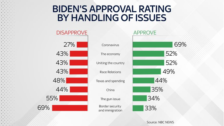 据美国有线电视新闻的民调统计,在拜登就任总统满100天之际,约52%的美国人认可拜登的整体工作表现,这一成绩仅好于其前任特朗普,但却低于自1953年的全部其他美国总统。除了在疫情应对方面民众满意度较高,为69%外,其他领域均在50%上下。在“边境安全和移民”方面民众满意度最低,仅为33%。