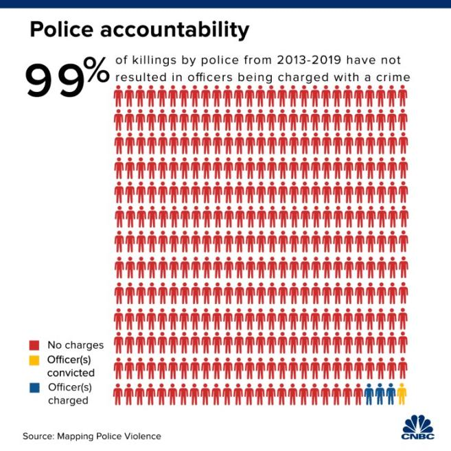 据美国媒体CNBC的统计,在2013到2019年间的总共7617起警察在执法过程中致人死亡的事件中,在99%的事件中,警察都没有遭到起诉。
