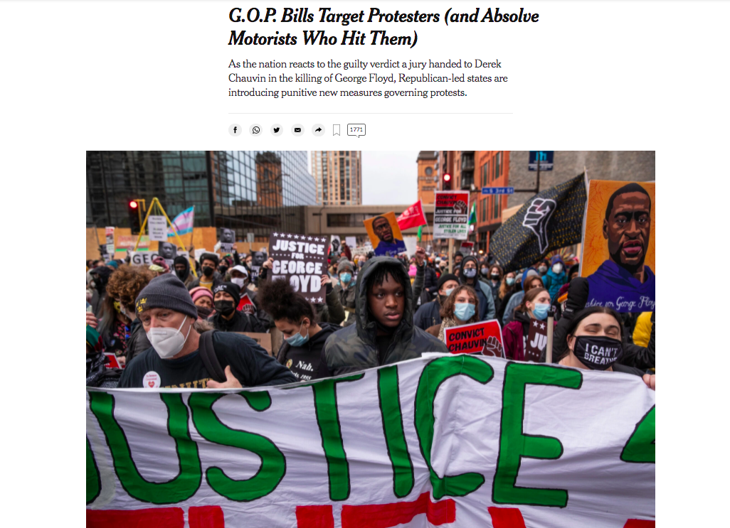 据《纽约时报》报道,从弗洛伊德事件发生至今,全美34个支持共和党或倾向支持共和党的州在地方层面总共通过了81项限制抗议者活动的法律,针对的对象便是“黑人的命也是命”的反歧视运动的抗议者。