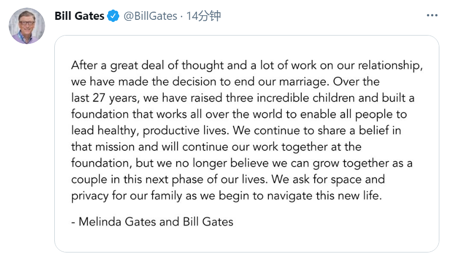 当地时间3日,比尔·盖茨与梅琳达通过联合声明,宣布结束双方27年的婚姻,声明中称,两人认为继续保持婚姻关系已经无法让彼此继续提升。