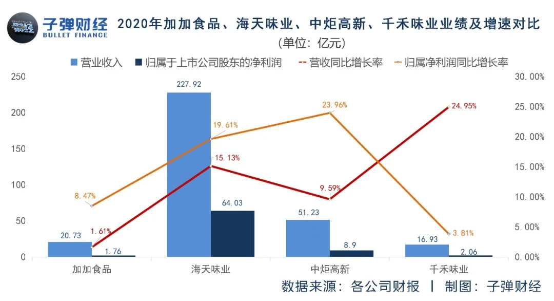 而在外部,以“中国酱油第一股”之姿登陆A股市场的加加食品,却没有抓住上市和餐饮业发展带来的红利,市占率被龙头老大海天味业远远甩开,利润甚至被曾经的“小弟”千禾味业赶超。