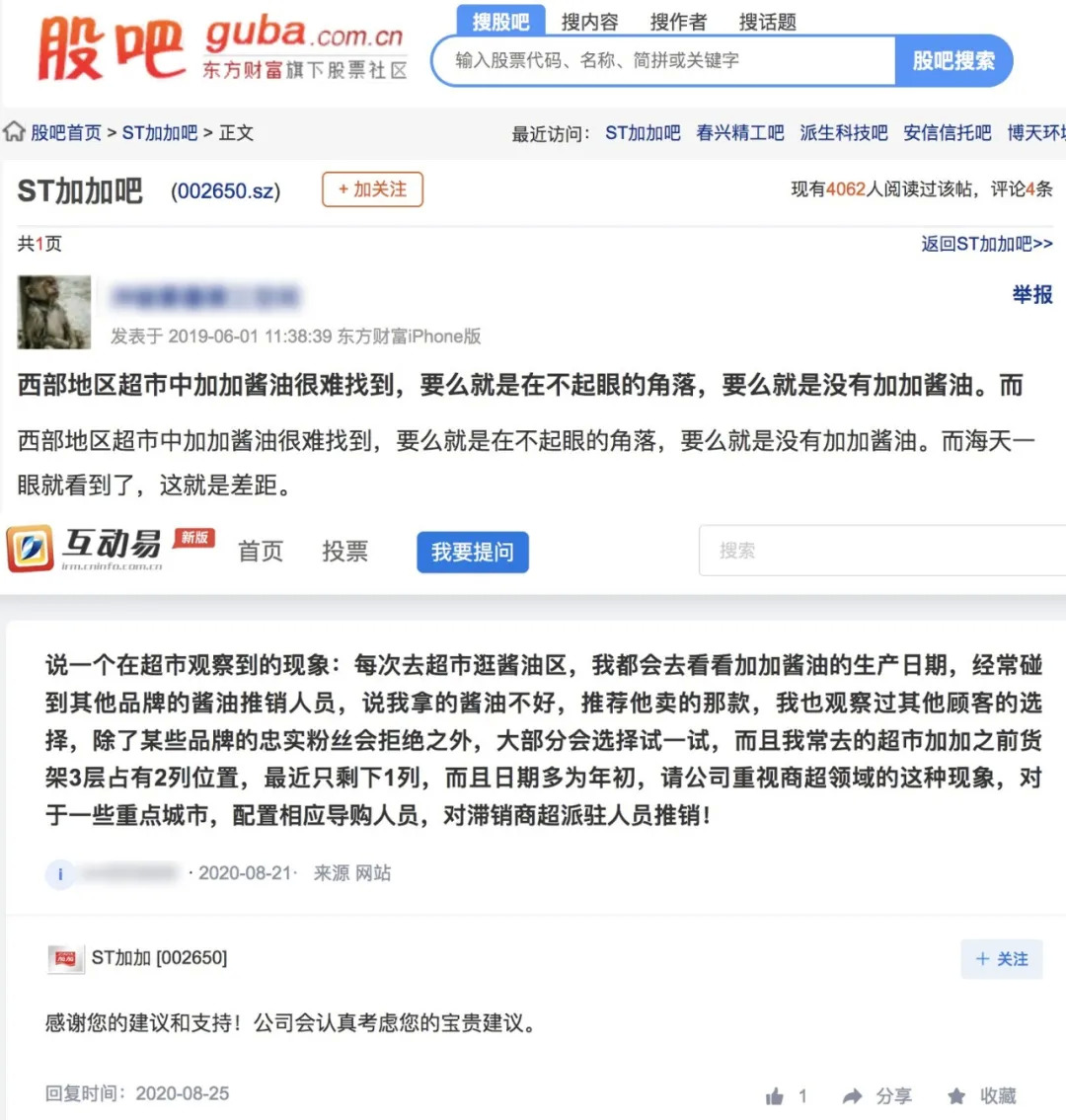 事实上,加加品牌陈列位少、产品难找的情形并非孤例。在投资者互动平台、各种社交平台,时有投资者、消费者抱怨加加产品在商超等线下渠道难以找到,陈列不足,推销不够。