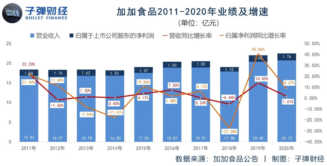 2020年,加加食品实现营收20.73亿元,归属于上市公司股东的净利润为1.76亿元。这一业绩,与9年前相比进步并不大。