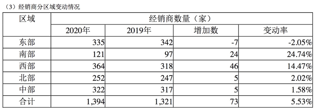不过,与上市时相比,加加食品经销商数量增长并不多。据加加食品招股书披露,彼时其已在全国各地发展了近1200家总经销商。而据其2020年财报披露,加加食品经销商数量全年增加73家,达到了1394家。