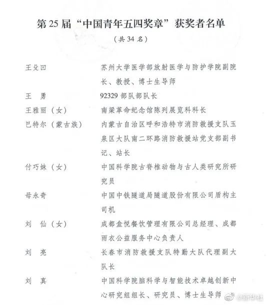 在五四青年节来临之际,共青团中央、全国青联共同颁授第25届“中国青年五四奖章”,表彰青年中的优秀典型和模范代表。