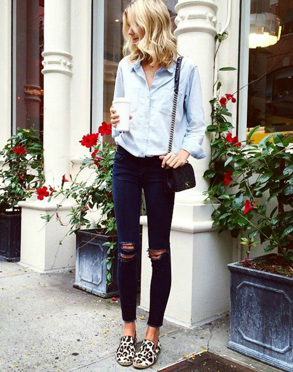豹纹款搭配衬衫、破洞丹宁: