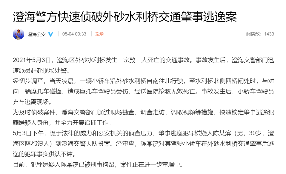 据广东汕头@澄海公安 5月4日通报,2021年5月3日,澄海区外砂水利桥发生一宗致一人死亡的交通事故。事故发生后,澄海交警部门迅速派员赶赴现场处警。