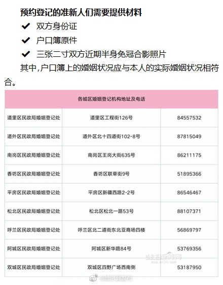 据@哈尔滨发布 消息,为方便准新人们,5月6日起,哈市民政部门9个城区婚姻登记机关均可接受准新人们的“520”结婚登记预约。5月20日当天,各婚姻登记机关工作人员将提前上班、延时下班,全力以赴保障结婚登记的新人都能如愿以偿地领到结婚证书。