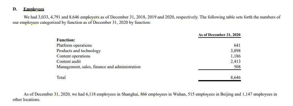 这是B站财报公布的其在2018年底、2019年底和2020年底分别拥有的员工总数。