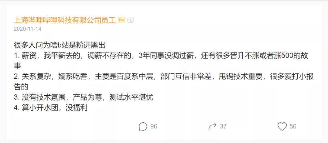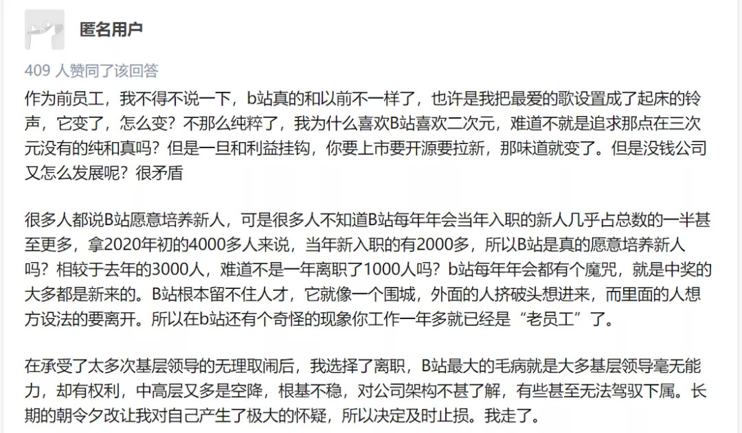 知乎问答“在哔哩哔哩工作是种怎样的体验?”下,有一则自称前员工的匿名用户回答透露的信息更显著: