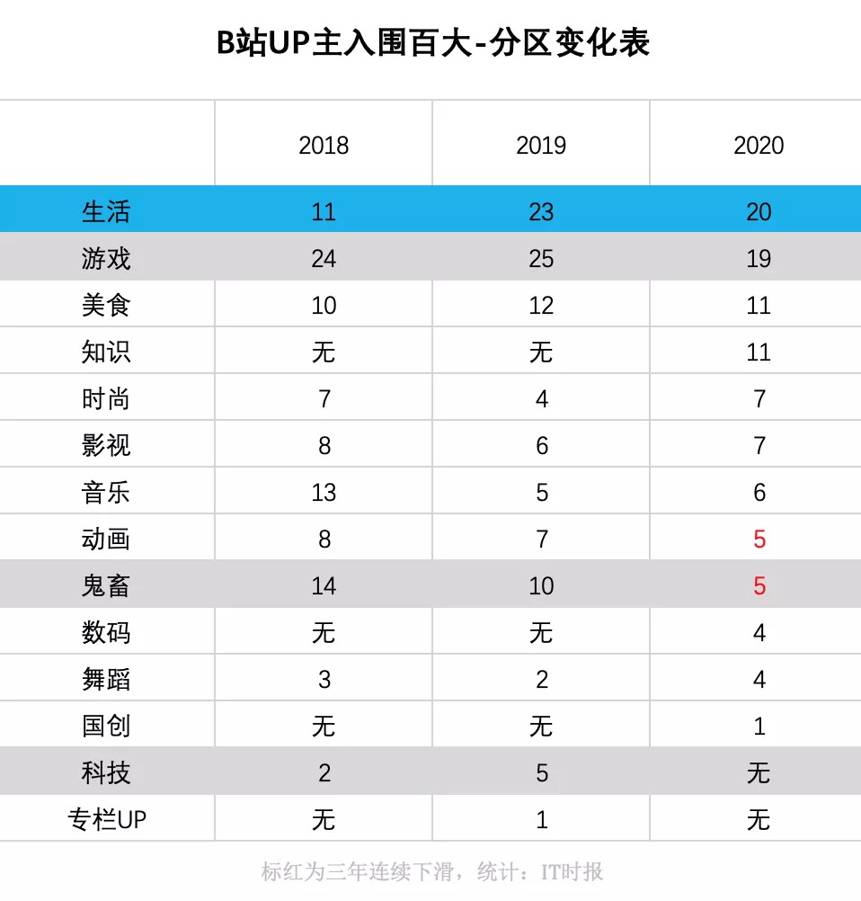 IT时报统计了近三年B站百大UP主的变化,新入选2020年百大的多达49名UP主,B站起家的内容里,动画、鬼畜连续三年下降,游戏区百大减少也很明显。