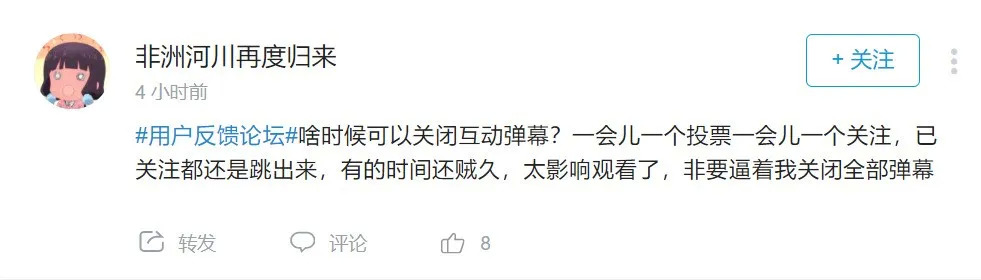 从B站用户反馈论坛看,对互动弹窗的相似意见不在少数,解决办法就只有关闭弹幕。