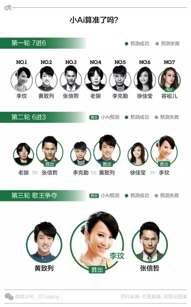人工智能(A.I.)可能会是一个很好的解决方案。在互联网的旗帜下,所有的渠道都数据化了,人工智能有着比普通电脑更强大的计算和分析能力,可以轻而易举地整合所有平台的数据,并分析出个中趋势。这就是阿里云的小Ai为《我是歌手》预测“歌王”的基本条件,对于小Ai来说,整合微博、优土等阿里渠道的数据,分析歌手的互联网话题热度,轻而易举。