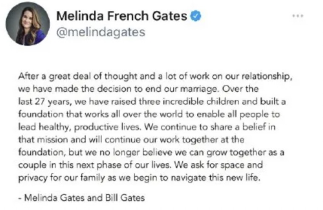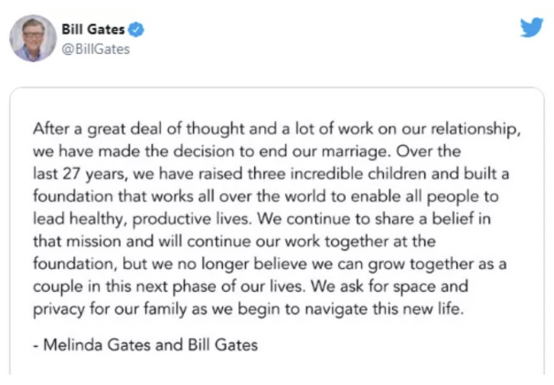 美国时间5月3日,比尔·盖茨和妻子梅琳达通过推特联合声明,宣布了两人27年婚姻的结束。