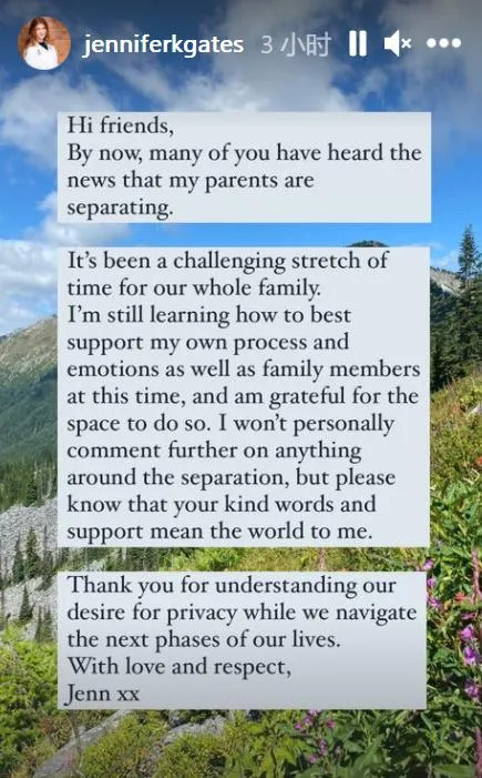 事实上,他们感情的破裂似乎早有端倪。几天前比尔·盖茨在发布一则关于家庭的文章《时间》时,就表示“这个家庭尽管遭遇困难的处境,却依旧深爱并支持着彼此”,似乎是意指自己家庭的问题。