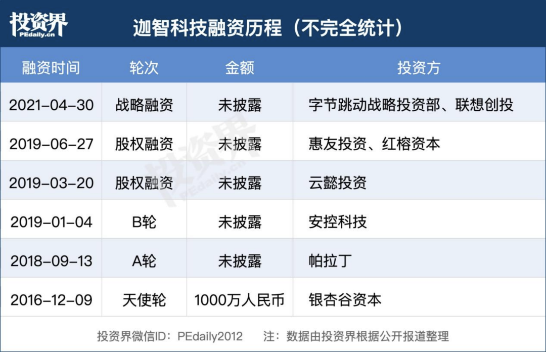 2016年,迦智科技刚成立半年时间便获得银杏谷资本天使投资。此后几年,迦智科技悄悄完成了4轮融资,投资方包括帕拉丁、安控科技、云懿投资、惠友投资、红榕资本等,却很少对外发布消息。