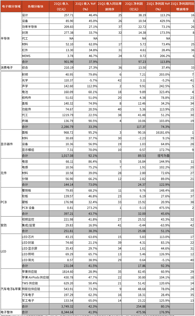 各个子行业细分领域 2021Q1 净利润 同比 增速排序前十名为:显示器件-面板(+16181.6%)、 PCB-PCB 设备(+475.5%)、半导体-设备(+429.5%)、消费电子-电池(+323.4%)、消费电子-声学(+242.5%)、半导体-MEMS(+206.2%)、消费电子-射频(+203.0%)、半导体-封测(+173.5%)、显示器件-显示模组(+172.7%)、PCB-覆铜板(+148.4%)。