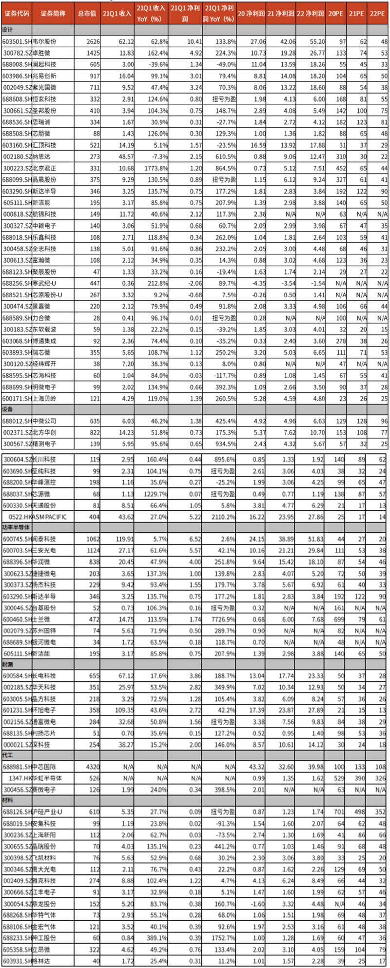 半导体电子各个细分领域 2021Q1 年同比增速情况为