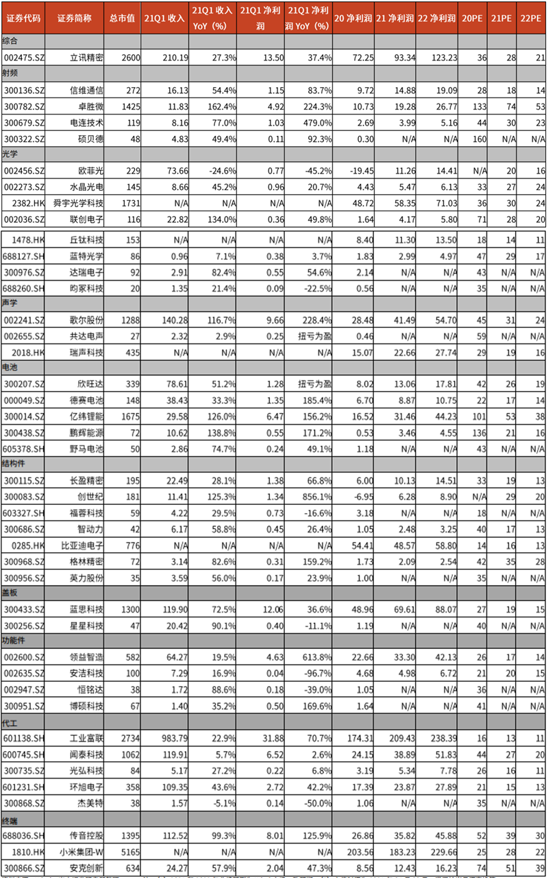 各个子行业细分领域2021Q1收入同比增速排序前十名为:PCB-PCB 设备(+273.2%)、消费电子-声学(+112.9%)、显示器件-面板(+95.2%)、消费电子-终端(+90.5%)、元件-电容(+86.4%)、消费电子-射频(+79.6%)、元件-电感(+75.2%)、消费电子-盖板(+74.9%)、汽车电子-特斯拉供应链(+73.3%)、显示器件-显示模组(+70.0%)。