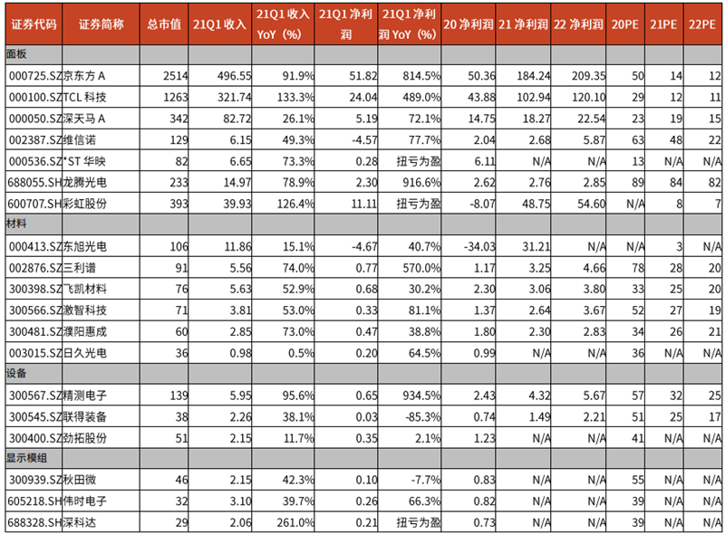▲显示器件领域重点公司 2021Q1 回顾(单位:亿元,%)