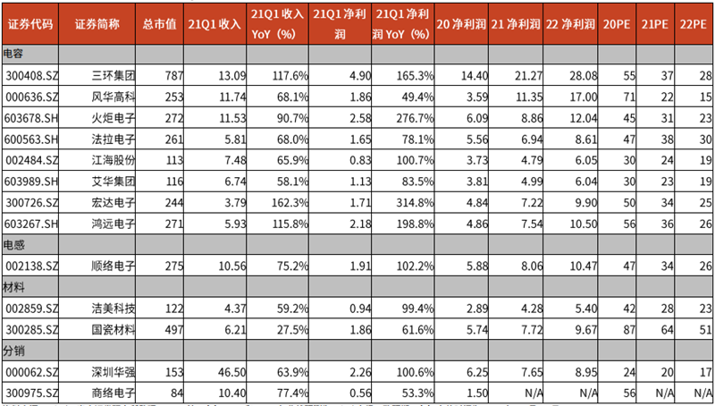 ▲元件领域重点公司 2021Q1 回顾(单位:亿元,%)
