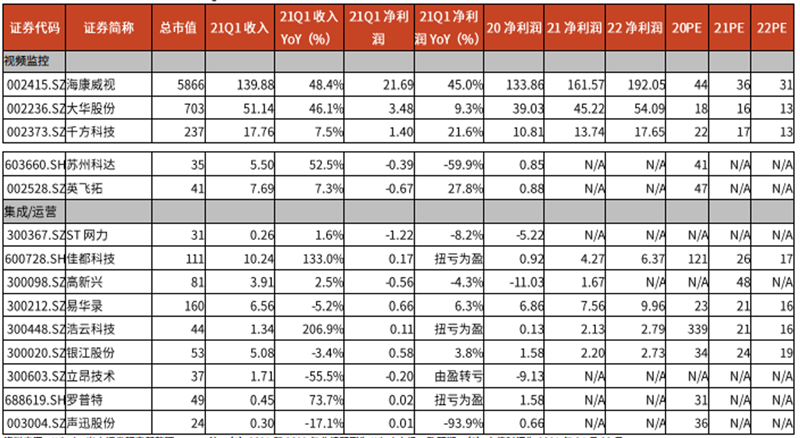 ▲安防领域重点公司 2021Q1 回顾(单位:亿元,%)