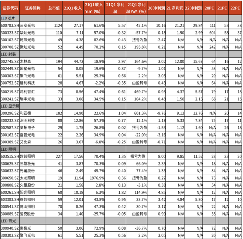 ▲LED 领域重点公司 2021Q1 回顾(单位:亿元,%)