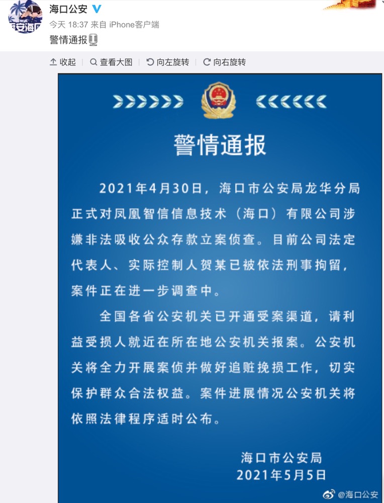 5月5日晚间,海南省海口市公安局通过官方微博“海口公安”发布警情通报称,公安部门已于4月30日正式对凤凰金融旗下P2P平台凤凰智信涉嫌非法吸收公众存款立案侦查,公司法定代表人、实际控制人贺鑫已被刑事拘留,案件正在进一步调查中。