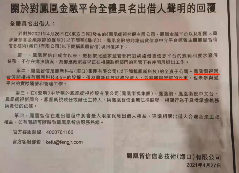 4月27日,即被警方立案侦查前三日,凤凰智信登报声明回复全体凤凰金融出借人称,“凤凰智信是凤新科技(海口)集团有限公司的全资子公司。凤凰卫视因合并间接持有凤新科技8.5%的股权,仅为凤新科技财务投资人,并非凤凰智信的股东,也未参与过平台的实际运营和管理工作。”