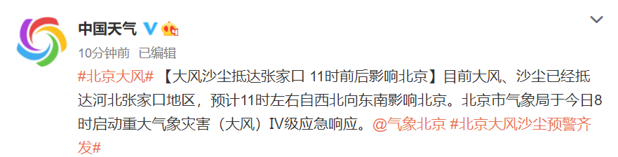 据@中国天气网 微博消息,目前大风、沙尘已经抵达河北张家口地区,预计11时左右自西北向东南影响北京。北京市气象局于今日8时启动重大气象灾害(大风)Ⅳ级应急响应。