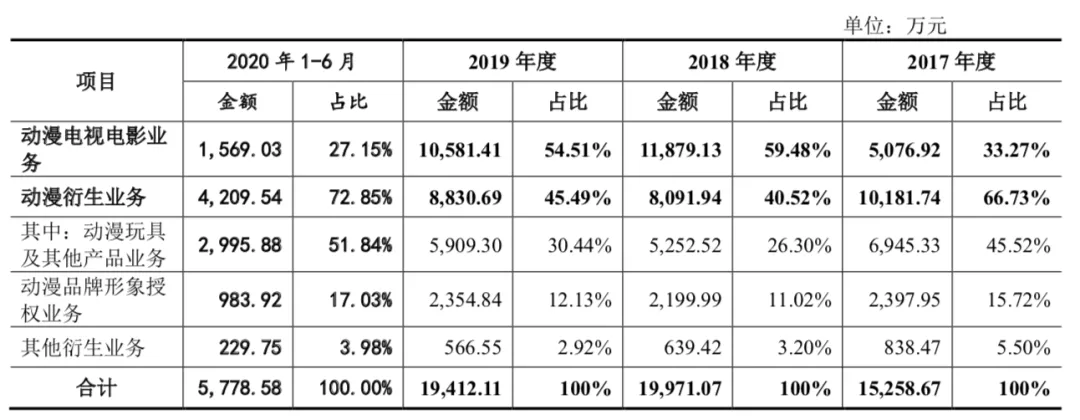 除了可以看的内容,猪猪侠的真正潜力则是在衍生品上。2019年,咏声动漫分别实现营业收入1.94亿,其中动漫电视电影业务带来的收入和动漫衍生业务带来的收入几乎持平。到了2020年上半年,其衍生业务的收入占总收入的比例达到了72.85%。