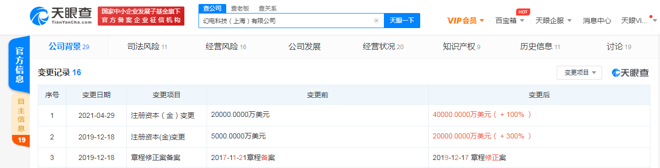 据天眼查APP显示,近日,B站关联公司幻电科技(上海)有限公司注册资本由2亿美元增加至4亿美元,增幅100%。