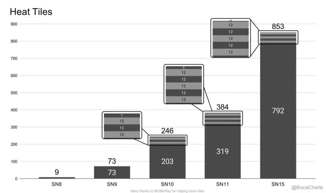 相比与此前爆炸的几代星舰,肉眼可见的区别就是它被增加了更多隔热片,足足800多片,而SN8-SN11 的隔热片数量才分别为7~8片、27片、246片、384,网友那句“什么时候贴满了什么时候就入轨了”的神预言怕是要变成现实。