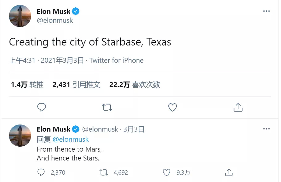 3月3日,马斯克正式提议将发射场所在地改名为Starbase(星际基地),还要围绕基地建造一座城市,未来人们可以从这里来往火星乃至外太空。在火星上,马斯克也规划了拟建的第一个人类火星基地——Mars Base Alpha“火星阿尔法基地”。