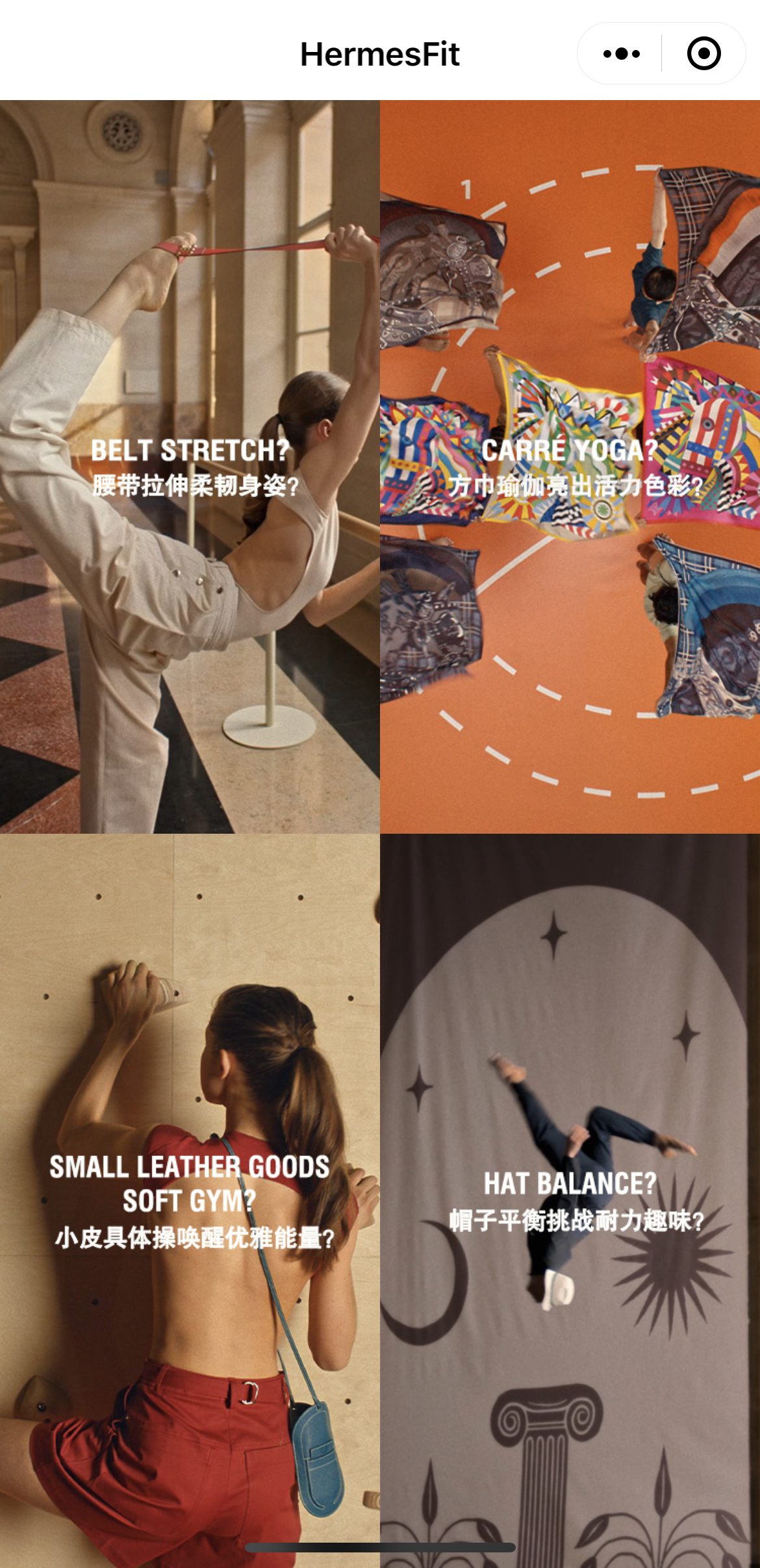 五一假期刚结束,爱马仕(Hermes)就在微信小程序上投放了一个与健身有关的新广告,名为“爱马仕健身”(#HermesFit)。