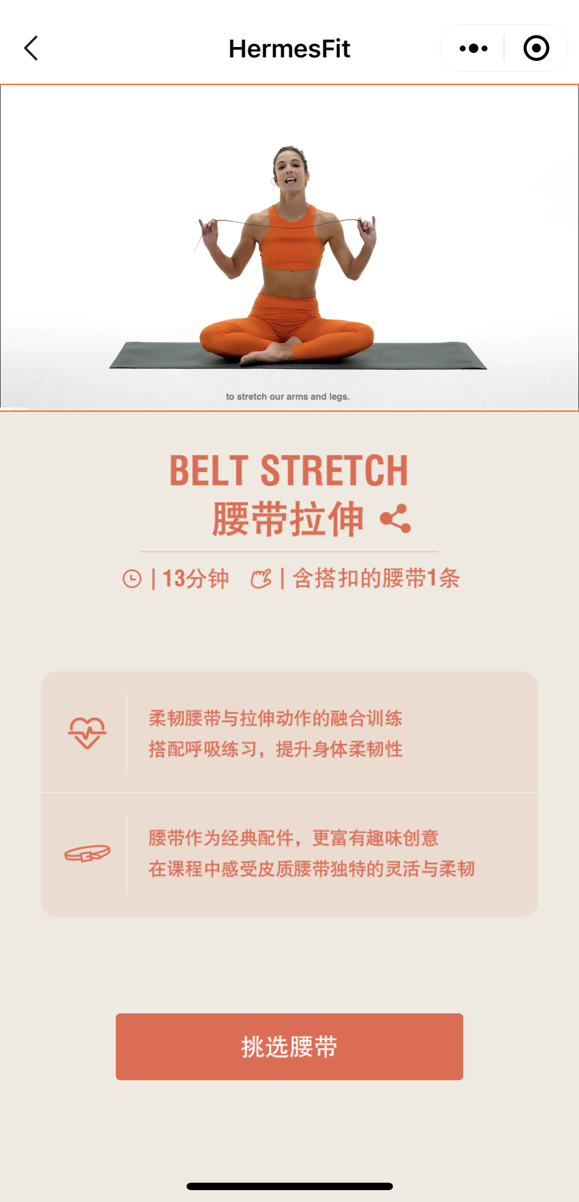 在这波推广中,爱马仕一共录制了四条时长介于13至21分钟的瑜伽健身短视频,分别介绍了如何在瑜伽训练过程里使用爱马仕皮腰带、方巾、小皮具和帽子。而在每段视频的下方,还配有文字说明和相关商品链接。