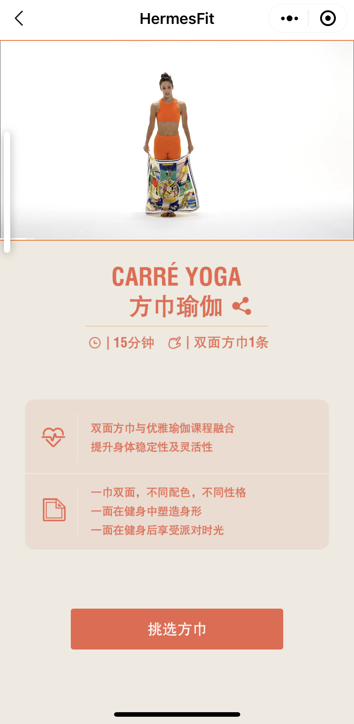 比如,爱马仕建议,其经典的方巾产品就可以作为瑜伽塑型的辅助工具,而爱马仕小皮具可以替代瑜伽“训练砖”,作为平衡训练时的辅助工具。