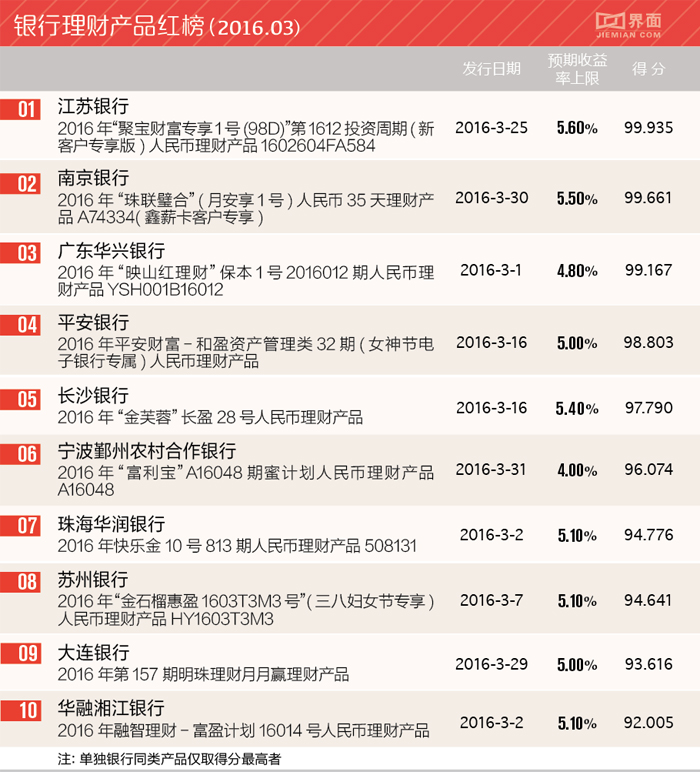 在银行红榜中,江苏银行登上榜首,其2016年“聚宝财富专享1号(98D)”第1612投资周期(新客户专享版)人民币理财产品5.6%的预期收益率上限远高于同期理财产品,98天的委托期也保证了投资者的资金流动性。该款理财产品投资方向为标准化资产及符合监管要求的债权类资产,风险较低,综合来看选择该款产品不失为当下市场环境下一个很好的选择。