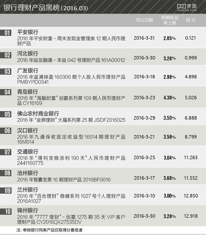 显然,银行理财产品仍是避险资金的首选。每个月,界面新闻会根据自己制作的一个涵盖数万只理财产品的数据库,对当月理财产品进行评估与排行。该数据库可以在银行间比较,也可以在衡量流动性、宏观经济等风险后挑出性价比最高和最低的产品,其挑选范围是全国范围发售的信息披露充分的非结构类理财产品,最终形成当月产品红黑榜。
