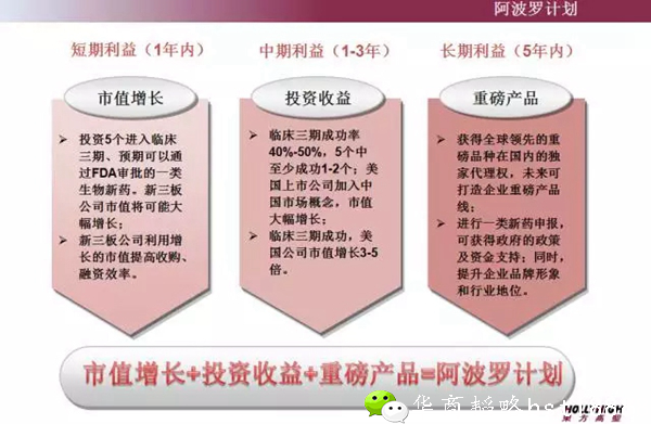 阿波罗计划的具体方案,是以30亿资金投资5个进入临床三期、预期可以通过FDA审批的海外一类生物新药,并分三个阶段获取投资回报:首先,一年内通过定增使投资平台东方略市值大幅增长,进而提高融资、并购效率;其次,三年内基于药品临床三期成功,使所投资的美国上市公司市值大幅增长;最后,在五年内获得全球领先的新药品种在国内的独家权益,并打造企业未来重磅产品线。