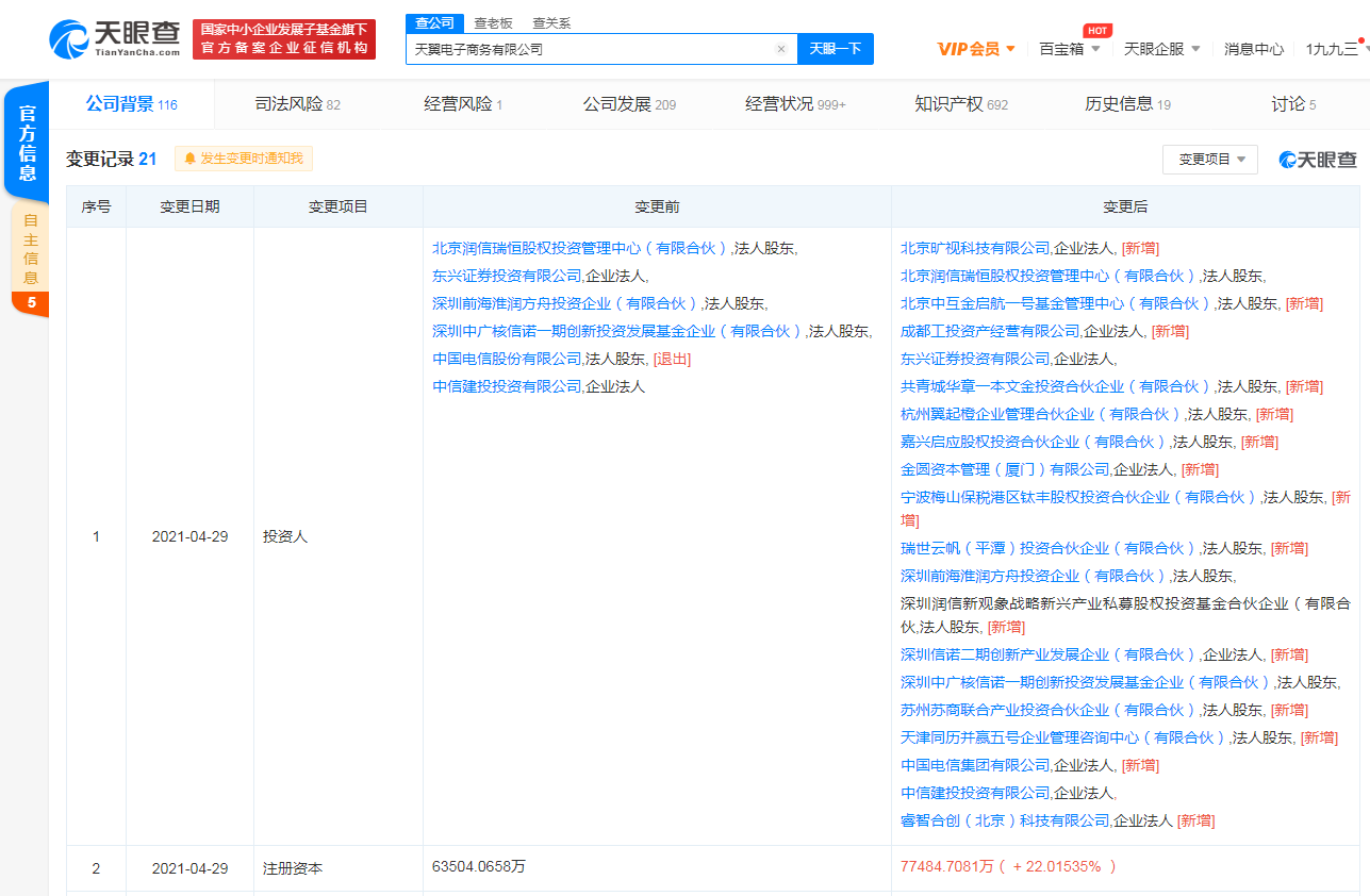据天眼查APP显示,近日,天翼电子商务有限公司发生工商变更,新增北京旷视科技有限公司、睿智合创(北京)科技有限公司等多位股东,同时注册资本由约6.35亿人民币增至约7.75亿人民币,增幅约22%。