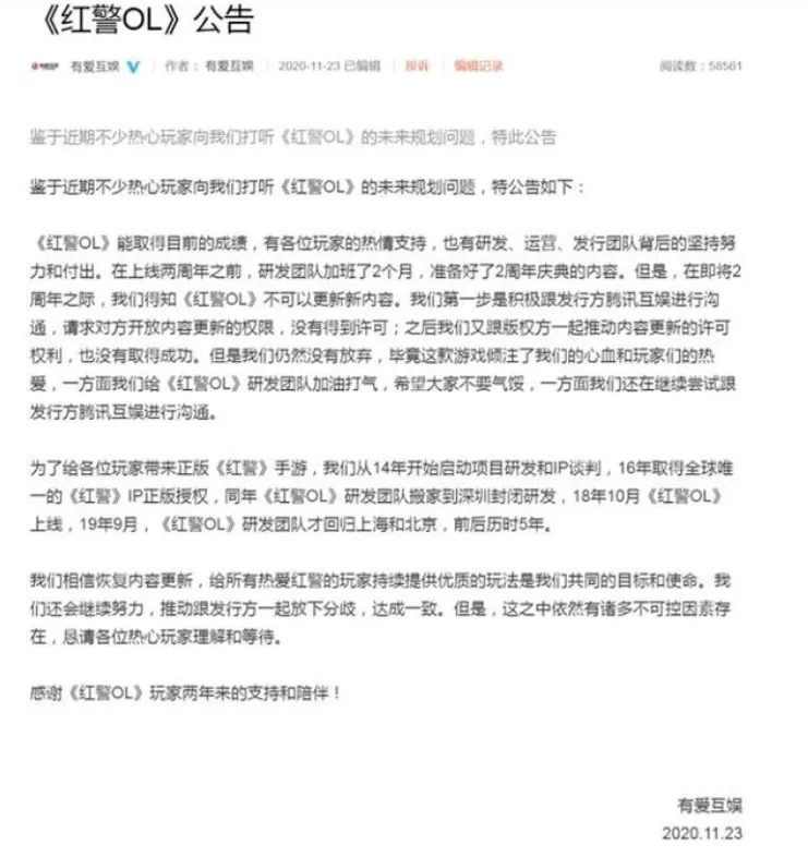 当时有爱互娱官方微博发布公告称:他们研发团队加班了2个月,早已准备好了2周年庆典的相关活动更新。但是却在即将2周年之际,得知《红警OL》无法更新新内容。这段公告将矛头直接对准了运营《红警OL》的腾讯。且这次停更的时间点十分微妙,正好处于字节跳动投资有爱互娱以后。也因此有传闻称《红警OL》的停更实则是腾讯与字节之间竞争矛盾的缘故。