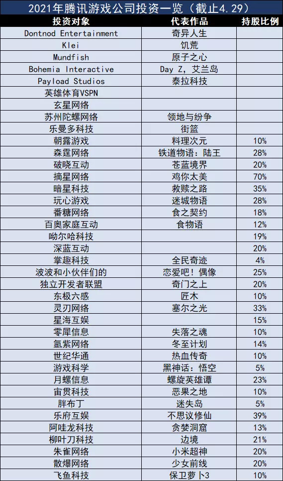 腾讯自2020年以来,其在投资上的步伐可谓是“真”坐上了火箭,2020年和2021年投资的公司总和,已经快要赶超腾讯过去十年的投资公司数量。仅2021年过去的4个月间,腾讯就投资了38家游戏公司,这其中国内外公司都有,又以占据了投资公司近三分之一数量的二次元游戏公司最为抢眼。